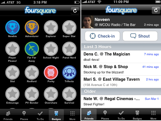 Aside from a basic ‘friend’ system, foursquare’s social features are pretty limited compared to services like Loopt and Brightkite. In lieu of a full-fledged social network, foursquare incorporates a gaming element, awarding users with points and merit badges for ‘checking in’ at a variety of locations. It’s here that the app really shines: these rewards give users an incentive to check-in frequently (a necessity given the fact that the iPhone can’t automatically update your location as you travel), and it’s far more fun than it sounds.