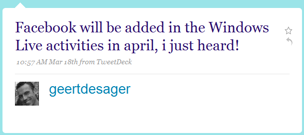 Now, if this tweet from Marketing Manager for Microsoft Advertising Southeast Asia Geert Desager speaks the truth, we can expect Facebook feed updates to be added to Windows Live Profile’s Web Activities feature as soon as in April, possibly at the upcoming Web 2.0 Expo event in San Francisco.