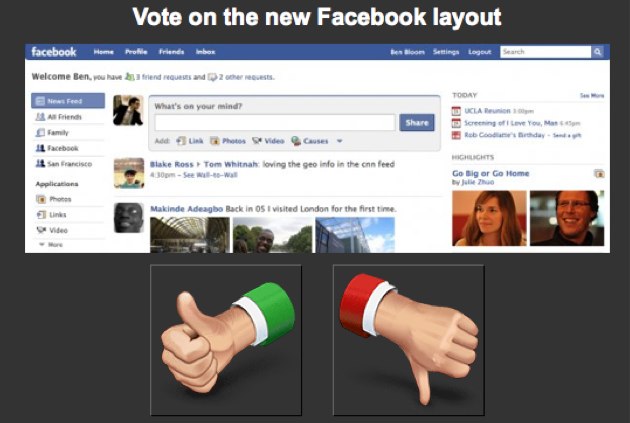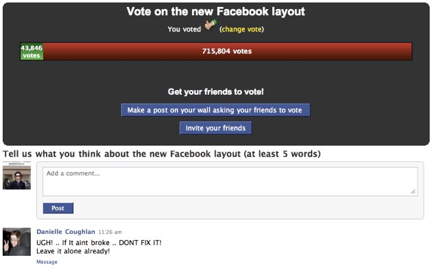 A Facebook application is polling users on the the new site layout . So far, just over 5% of the nearly 800,000 respondents give it a thumbs up. The rest go the other way.