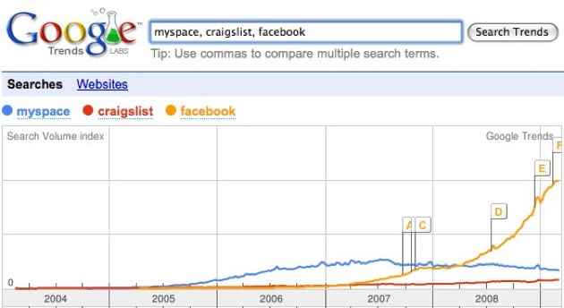 But the real data is out there for the taking. Google Trends shows Google search data, and since Google commands such a large lead in search in most countries, presumably the data is accurate. Google trends shows exactly the opposite data as Hitwise – Facebook is by far the most queried term, followed by MySpace and then Craigslist.
