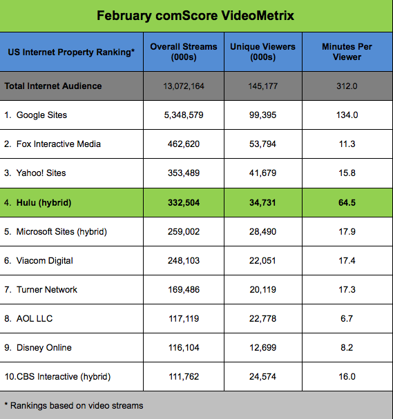 In a single month, Hulu overtook Viacom and Microsoft in total viewers and video streams (see January data). And Hulu is catching up to No. 3 video site Yahoo, which streamed 353.5 million streams in February. Fox Interactive (MySpace) was No. 2 with 462.6 million streams. And YouTube once again blew everyone else out of the water with 5.3 billion streams.