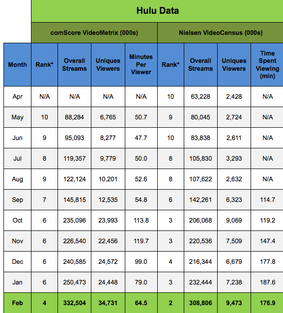Hulu jumped two spots to become the fourth largest video site in the U.S. in February, according to the latest data from comScore VideoMetrix. Hulu drew an audience of 34.7 million people who watched 332.5 million video streams. That is a 42 percent increase in unique U.S. visitors, up from 24.5 million in January, and a 33 percent increase in streams, up from and 250.5 million streams.