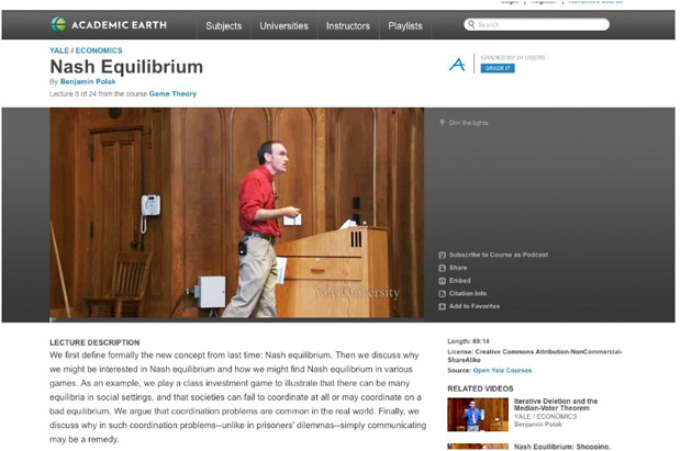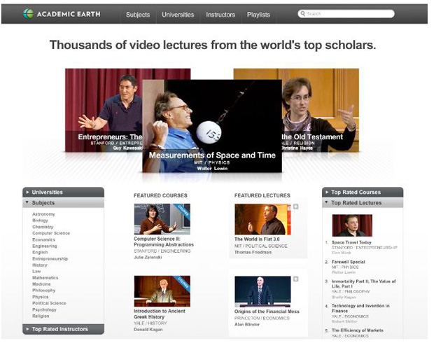 So Ludlow launched Academic Earth with the goal of building a user-friendly platform for educational video that would let anyone be able to freely access instruction from the scholars and guest lecturers at the leading academic universities. The site offers 60 full courses and 2,395 total lectures (almost 1300 hours of video) from Yale, MIT, Harvard, Stanford, UC Berkeley, and Princeton that can be browsed by subject, university, or instructor through a user-friendly interface. Additionally, editors have compiled lectures from different speakers into Playlists such as “Understanding the Financial Crisis” and “First Day Of Freshman Year.” The site also features a roster of famous guest lecturers on entrepreneurship and technology including Larry Page, Carol Bartz, Tim Draper, Elon Musk, and Guy Kawasaki.