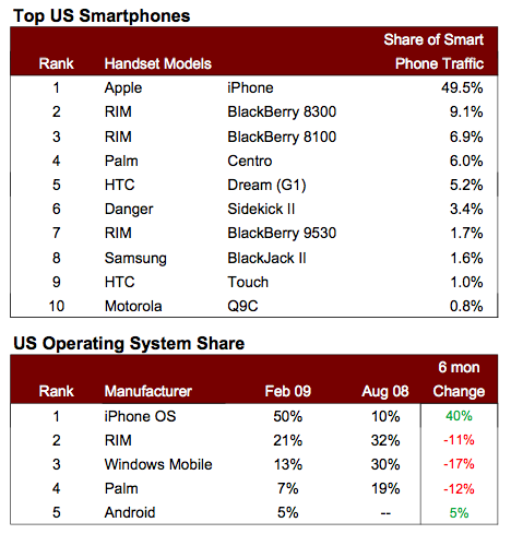 The iPhone now accounts for 50 percent of mobile Web traffic from smartphones in the U.S., according to an AdMob Mobile Metrics report released this morning. Over the past six months, the iPhone has taken share from Blackberry and Windows Mobile. In August 2008, the iPhone made up only 10 percent of mobile Web traffic from smartphones. During the same time, Blackberry’s share has gone from 32 percent to 21 percent (with the Curve and the Pearl coming in stronger than the Storm), while Windows Mobile has taken an even bigger hit, declining from 30 percent to 13 percent. Palm is also down to 7 percent from 19 percent six months ago.
