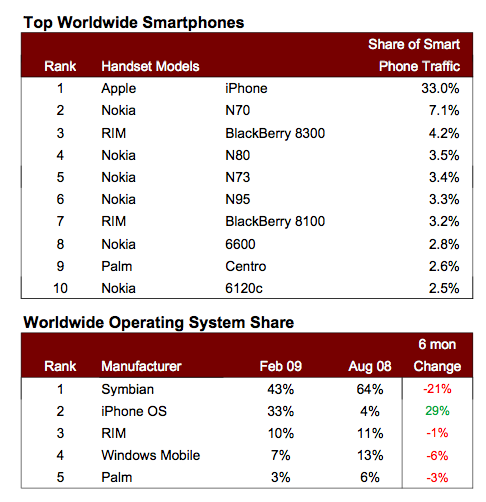 On a worldwide basis, smartphones running on the Symbian OS (mostly from Nokia) still dominate mobile Web traffic with a 43 percent share. But that is down from 64 percent in August. The iPhone has gone from 4 percent to 33 percent of mobile Web traffic on a worldwide basis. All the other mobile operating systems are down as well.