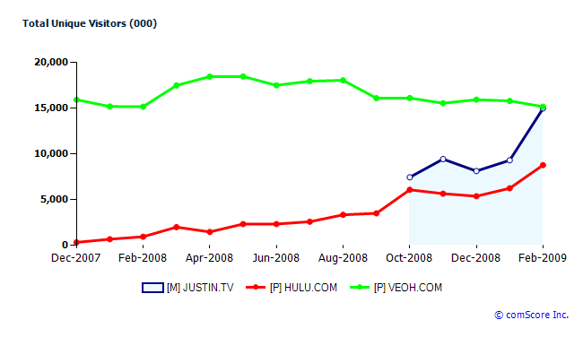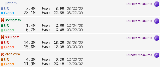 Quantcast, which directly measures all three sites, shows a similar trend. Globally, Justin.tv has 22.1 million monthly uniques, compared to 15.8 million for Hulu, and 11.9 million for Veoh. While the U.S. numbers are 3.9 million for Justin.tv, 14 million for Hulu, and 4 million for Veoh. (Ustream.tv seems to be the second-largest live video streaming site with 6.7 million global monthly visitors and 1.4 million in the U.S.). These are all site numbers, Quantcast also measures “network” numbers which presumably includes videos embedded elsewhere, and those are about double the site stats for each service. Justin.tv itself claims 1,800 percent year-over-year growth in unique visitors based on its internal Google Analytics numbers.