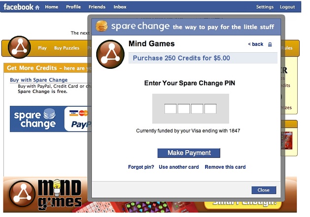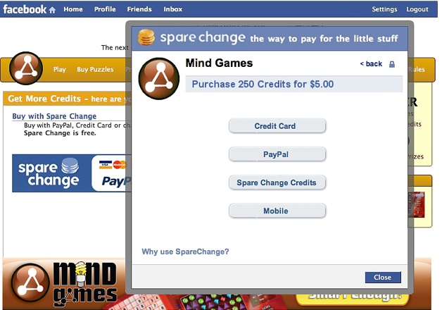 The first app to launch with the new widget is Mind Games on Facebook. It requires developers to add only three lines of code. Spare Change will roll it out to MySpace and Bebo soon. Spare Change is designed specifically for social networks. Customer support is done via the direct messaging systems inside each network, and the company analyzes the social graph to sniff out fraud. For instance, it looks at how many friends someone has and other factors to assign risk scores to individual consumers. Spare Change has been bootsrapped with only about $500,000 in seed funding, and two of the co-founders (Mark Rose and Simon Ru) previously worked at Paypal.