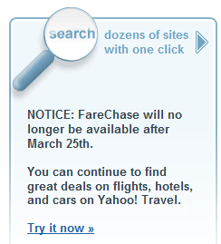 Yahoo is cutting more fat today by closing its travel bargains website FareChase, which it originally acquired back in July 2004 and re-launched two years later. The company will be announcing the shut-down later today, and will start redirecting visitors of the service to its main travel site soon.