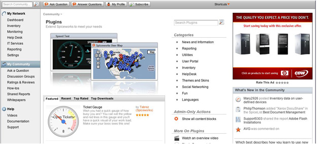 IT software maker Spiceworks has developed a set of customized plugins and widgets in a variety of categories for the Spiceworks desktop. Spiceworks’ ad-supported, free IT management software allows IT managers at small to mid-size businesses keep track of their network assets, run a helpdesk, monitor activity, receive reports and troubleshoot network problems.