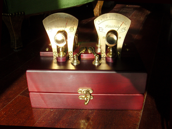 My Chronulator was made of a tea box, some pieces of brass curtain rod ends ( not sure of the translation ) then a piece of amarante wood, patiently cutted and varnished.