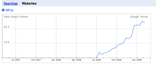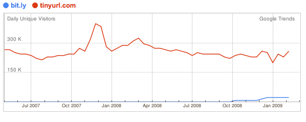 But wait. Bit.ly seems to be shooting up like a rocket, while TinyURL may have plateaued. Why is bit.ly growing so much faster? One big reason is because it creates even shorter URLs than TinyURL does by about five characters (http://bit.ly/ versus http://tinyurl.com/). Don’t laugh. Every character counts. Bit.ly also offers better analytics and tracking tools on the backend.
