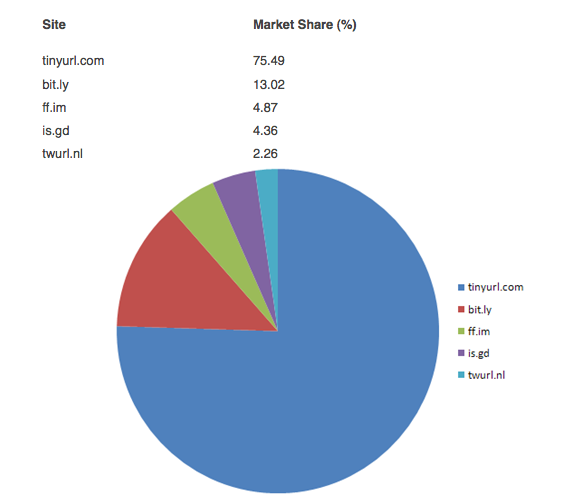 But here is some fun math. Assuming bit.ly sold 20 percent of its shares to its new investors (the O’Reilly Alpha Tech Fund, Mitch Kapor, and Howard Lindzon), that would imply an $8 million pre-money valuation ($10 million post-money). Its market share of shortened links, as calculated by Tweetmeme, is only 13 percent. The biggest URL shortner out there is actually TinyURL, which commands a 75 percent share. So by that metric, if bit.ly is worth $8 million, TinyURL should be worth at least $46 million (8/13 X 75 = 46.15). Yes, I am making up these numbers, just like the investors do.