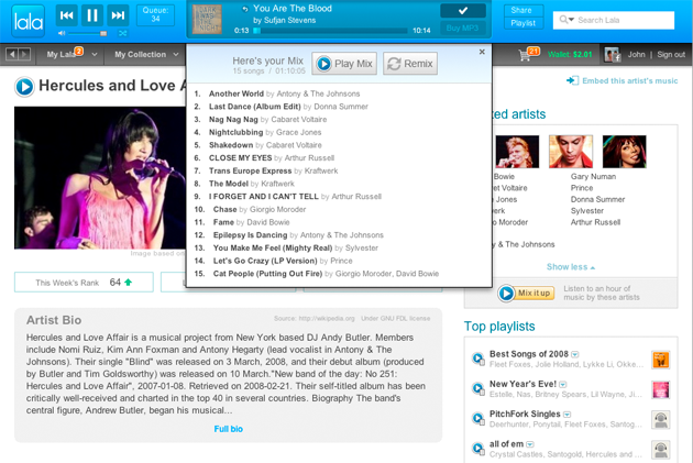 The redesign builds on the site’s persistent music player, which sits at the top of the browser window no matter where on Lala’s site they go. Users can now view a pulldown-menu with a list of songs, and there’s a similar pull down menu for playlists.