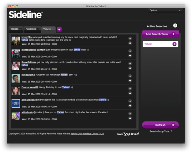 Yahoo has launched an Adobe AIR-powered desktop application called Sideline yesterday, once again validating the power of Twitter for real-time search. After taking it for a spin, I have to say it looks and feels really nice, but other than that there’s no real incentive for me to keep using it on a regular basis.