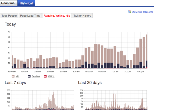 Keeping with Betaworks’ focus on real-time data services, Chartbeat offers a dashboard for Website owners that monitors how many people are on their site at any given second, where they are coming from, which pages visitors are looking at the most, as well as conversations and links from Twitter. It also shows average load times, what percentage of current visitors are returning, how many are reading, how many are actively writing in comments or engaging with the site in some other way, and how many are simply idle. Webmasters can set up alerts for traffic peaks and site slowdowns. All it requires is one line of Javascript to be inserted on a site and then it pings Chartbeat every 10 seconds.