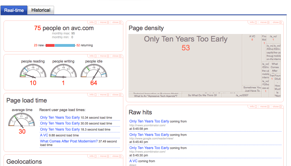 The dashboard also offers a historical view, and even lets you play the dashboard through time like a movie so that you can see for instance what was going on during a particular peak—where was traffic coming from and what were visitors looking at. If you choose, you can also share your dashboard and make it public. Venture capitalist Fred Wilson has done so for his blog A VC. Click through to his blog, and then you can see the results on his Chartbeat here. The video below also shows what it looks like.