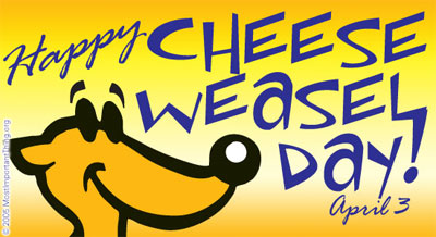 Unknown to most, April 3rd is Cheese Weasel Day, the holiday where the Cheese Weasel brings dairy goodness to all the good boys and girls in the tech industry. While the origins are murky, it seems to have started around 1992 when a weasel was spotted carrying a Kraft Single. This, they assumed, must be the Cheese Weasel, and therefore, that it must be Cheese Weasel Day. What was the weasel going to do with the cheese? He must be off to put it under the keyboards of good tech workers everywhere.