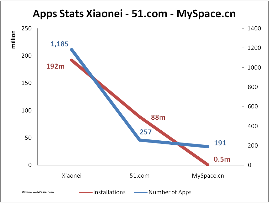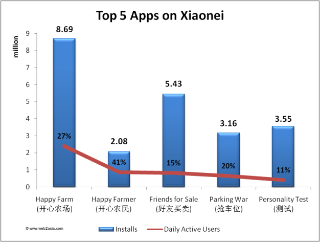 While Chinese social networks started out as mere clones of existing sites, they’ve managed to innovate the business models to create a very lucrative market by cementing the relationship between application developers and the site’s user base. Happy Farm, the most popular app in China reportedly collects well over $75k a month through installations on various platforms, and according to Chinese application tracker, Appleap, the value of the total social network’s apps install base is approx. $4.5 million.