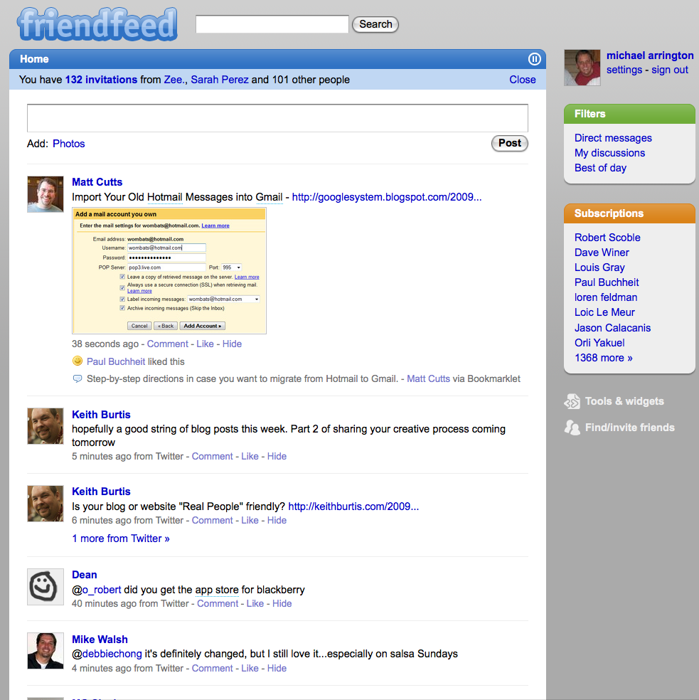 One thing is for sure, though: FriendFeed moves the fastest. They were the first to add comments to status updates, the first to bring in third party feeds and the first to realize the value of search. They also experimented with real time streams way before the others. So much of what they’ve done first has been copied by others – even Google has dipped into the well.