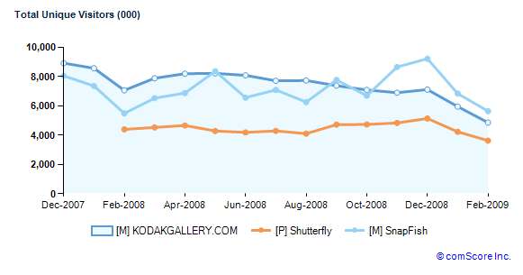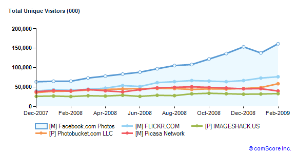 If you look at comScore numbers, however, it is clear that Facebook is gaining the most usage overall, with 161 million unique visitors worldwide in February. Flickr is a distant but strong second with 76.5 million visitors. Photobucket is at 58.6 million uniques, Picasa is at 39.9 million, and ImageShack is at 33.2 million.