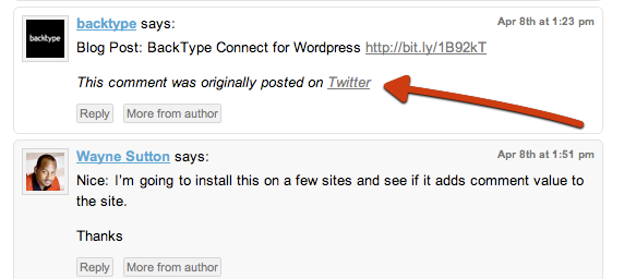 But BackType Connect has some weaknesses that will likely keep larger blogs from using it for now. For one, some of the sources (especially Twitter) can be very spammy. Blog admins can pick and choose which services they’d like to include, but it looks like the filters for services that are enabled need some work (Update: Founder Christopher Golda notes in the comments that you can also use WordPress comment filters to keep spam out). There’s also apparently no way to preserve the original comment threads when importing them, which can make some comments appear totally out of context.