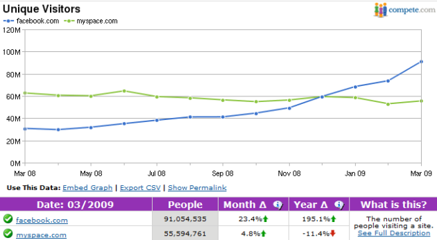 At the end of last month, we reported that its traffic is going through the roof too, according to recent worldwide comScore data. The data also showed that more than 1 in 4 people with Internet access visited Facebook in February 2009, translated to 276 million monthly unique visitors (or more than twice the size of MySpace’s traffic globally).