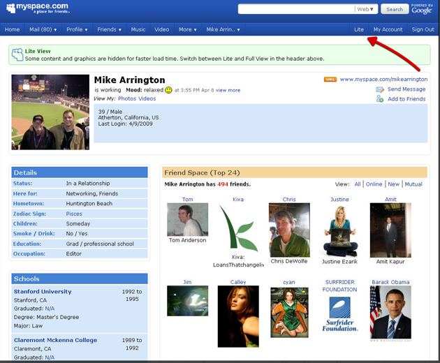 MySpace may be marketing ‘Lite’ profiles towards international and dial-up users, but it has one potentially more far-reaching implication: it gives users the ability to browse MySpace with a single, unified interface. One of the long-standing advantages Facebook has had over MySpace is its clean, structured appearance – Facebook allows a small degree of customization, but users always know where to look when they want to find a member’s bio or their list of friends, which isn’t always the case on MySpace. Granted, some MySpace users are drawn to the site specifically because they want to be able to load up their profiles with movies and photos, but most of us would at least like the choice to ignore this content. Now, MySpace is giving us a way to do exactly that, even if they aren’t too eager to promote it that way.