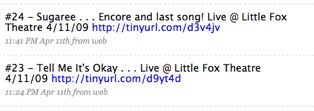 On April 3, Moonalice, which also includes ex-Saturday Night Live guitarist G.E. Smith, held its first live Twitter-integrated concert at a venue in San Francisco. Immediately following each song during the show, Moonalice’s sound team took the song’s audio, digitized it, uploaded it and then “Tweeted” about its availability — all before the group finished playing the next song at the live concert. The sound team used TinyURL to Tweet a link to a site where users could listen and download the song. Moonalice saw such a resounding response from followers on Twitter and fans that the band decided to do the same thing for the next two concerts. Because of the live Twitter integration, Moonalice says that its seen 3000 downloads of its music in the past week and a half (from just the tweets and retweeting).