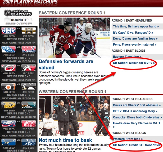 Sports-blog network SB Nation is now officially sanctioned by the NHL. Posts from its 29 hockey blogs now appear as linked headlines on the homepage of NHL.com. CEO Jim Bankoff, a former AOL executive, tells me that he is in discussions with other major sports leagues for similar link deals. You’d think that investor Ted Leonsis, the former AOL vice chairman who owns the Washington Capitals, helped make some introductions at the NHL. But Bankoff says that wasn’t the case. We’ll see if the other leagues bite.