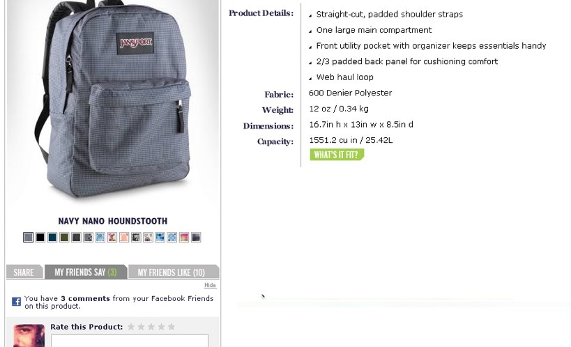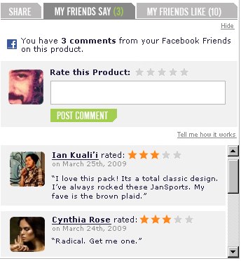 Here’s how it works. If you see an item you like while browsing a retail site, you can request feedback about a product from your friends by pushing information about the product (such as images from clothing, links to products, and movie clips) to your Facebook status update. Under the product image, you are given the option of clicking on a ‘Share on Facebook’ button and are prompted to add the given retailer’s Facebook application. Once added, you can rate the item and ask for feedback via a link back to the product that is published directly into your status update feed.
