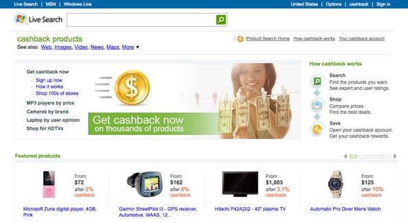Microsoft says that Live Search Products and Live Search Cashback have now been unified into a single experience. You can now access Cashback on Live Search Products page, which is Microsoft’s comparison shopping vertical site. Microsoft has migrated Cashback from the Jellyfish platform (the social shopping site that Microsoft purchased in 2007) to the Live Search platform.