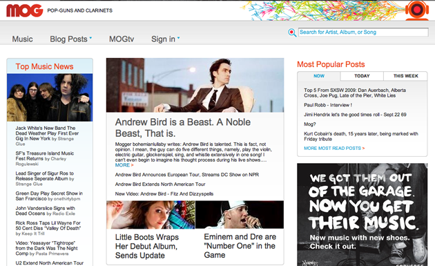 Mog, a music-centric blogging network that launched back in 2006, is evolving once again. The site has relaunched its homepage at Mog.com to serve as an authoritative destination site for music news. It has lofty goals, aspiring to become something akin to a ‘Huffington Post for music’ with a constant stream of content that lures visitors to come back multiple times a day. Coming up with that much quality content isn’t normally easy or cheap, but MOG has at least one ace in the hole: its entire editoral staff consists of only six people, and its contributing authors aren’t getting paid – they’re just writing about what they love.