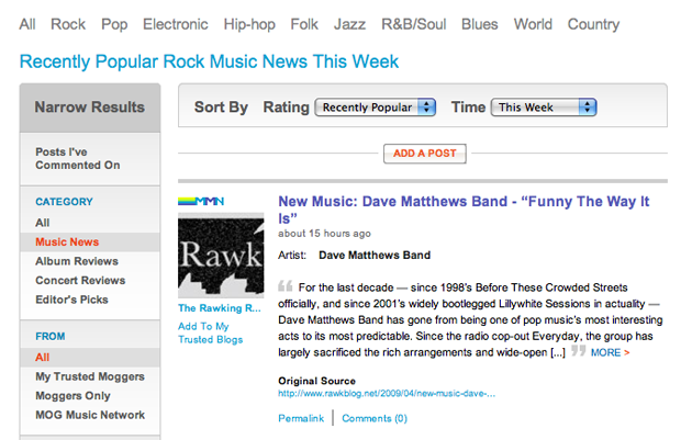 Before now, MOG has largely failed to capitalize on its expanding base of bloggers – users browsing its homepage would be shown the most recent posts, with no system present to filter for quality or subject matter. As the site has grown, this stream of posts has become nearly unusable (some of MOG’s 5,000 posts are not written by particularly adept writers), which had led to a poor user experience. To put it bluntly, nobody ever really visited the MOG homepage again after seeing it for the first time.