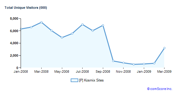 Kosmix, the universal search engine that dynamically generates guides to search queries using dozens of different content sources, is quickly gaining momentum. According to today’s latest comScore numbers, the site has jumped up to 3.2 million monthly uniques in March – a 419% growth since February.
