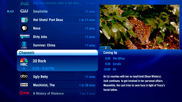 However, the GUI doesn’t take advantage of an HDTVs real estate properly when surfing the channels. The layout is a vertical bar, which fits great in a SDTV but leaves a lot of unused space that could show more info on an HDTV. This complaint could be that I cannot stand the vertical channel bar and its limited info. TiVo offers a similar guide layout, but also allows for a grid type display, which shows future events on numerous stations simultaneously.