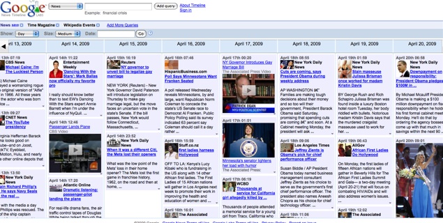 Timelines are becoming an increasingly popular user interface. Today, Google Labs launched a new product called Google News Timeline, which lays out the top stories from Google News in columns for each day. You can scroll down to see more stories or, of course, can search for specific topics or keywords. (It also launched similar image search)