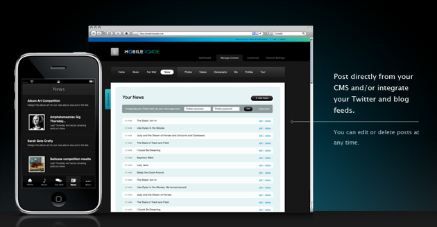 The application supports a wide range of content, including photo galleries, streaming music (which can be linked to songs for purchase on iTunes), YouTube videos, a list of upcoming shows, and interactive features, like a ‘fan wall’ where users can post comments and photos in real time for all to see. On the backend, bands will have access to an intuitive CMS, where they’ll be able to update photos and video, manage comments, and post news stories. They can also choose what price they’d like their app to sell for on the App Store.