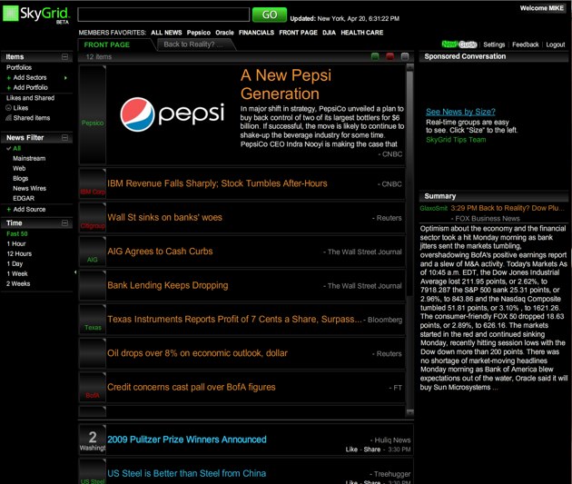 In January we wrote about SkyGrid, the $6,000 per seat/year financial news product that gives users real time updates via a flash interface on the stocks and sectors they are interested in. Today the service completes its transition to a free service that anyone can use and launches into private beta. You can sign up for it here. Existing users are also given invitations to the service as well, so once you are in you can get your friends on the service, too.