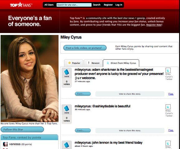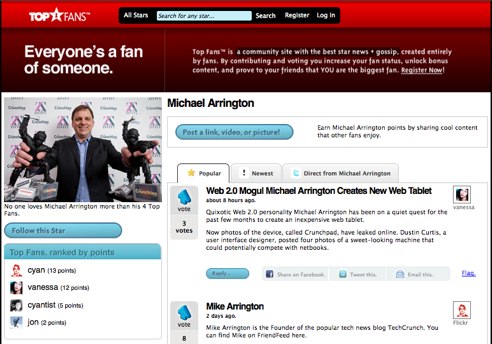 The pages themselves are similar in theory to a MySpace page or Facebook pages for celebrities, but Top Fans hopes to differentiate itself in several ways. First, celebrities can directly import their Twitter feeds into their Top Fans pages. Like on a Facebook fan page, there is the ability to import RSS feeds into an activity stream. But Top Fans’ technology also crawls the web for news and images of the celebrity that will be imported into the main news feed on the page. Fans can also contribute comments and content to the site feed. The pages include a Digg-like button next to each piece of content that allows fans to vote whether they like the content or don’t like it. The highest rated content goes to the top of the feed. And unlike Facebook, where celebrities often have an “official” page and unofficial pages that have been created by fans, Top Fans ensures celebrities that they only have one centralized page with no duplicates. Pages can be created by fans or the celebrities themselves.