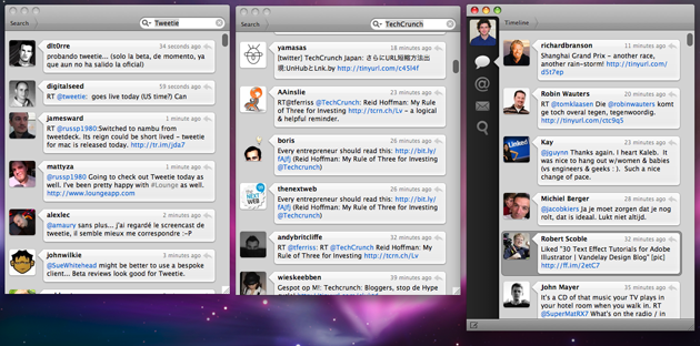 Tweetie is available for free with advertising, or for $14.95 for an ad-free version (it will jump up to $20 in two weeks). If you are on a Mac and crave your multiple columns, be sure to check out Nambu, which I’ve also enjoyed using for the last few weeks.