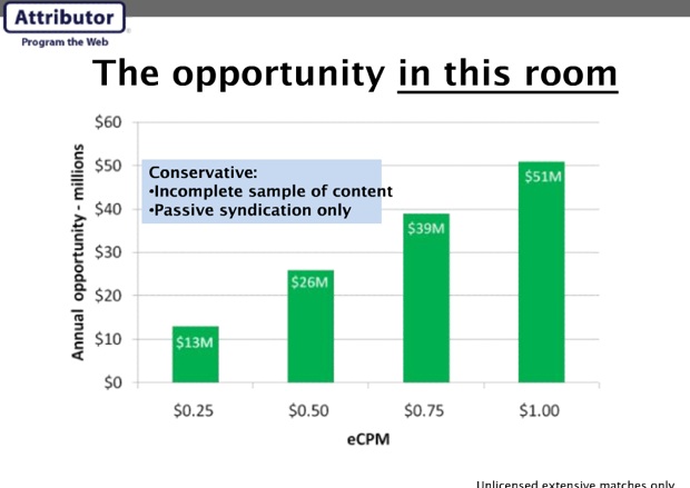 I know a little bit about this because in January I was invited to a meeting at the A.P.’s headquarters with about two dozen other publishers, most of them from the print world, to discuss the formation of the consortium. TechCrunch has not joined at this time. Ironically, neither has the A.P., which has apparently decided to go its own way and fight the encroachments of the Web more aggressively (although, to my knowledge, it still uses Attributor’s technology). But at that meeting, which was organized by Attributor, a couple slides were shown that really brought home the point to everyone in the room. One showed a series of bar graphs estimating how much ad revenues splogs were making simply from the feeds of everyone in the room. (Note that this was just for sites taking extensive copies of articles, not simply quoting). The numbers ranged from $13 million (assuming a $.25 effective CPM) to $51 million (assuming a $1.00 eCPM).