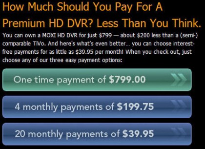 Despite some initial issues with the Moxi HD DVR, I’m starting to dig the $799 DVR. Digeo has plans to soften the overall cost though with a monthly payment plan. The overall $799 price hasn’t changed though, but maybe this payment approach will help move some more of the units. The $799 price is still a touch high, even though there are not any monthly fees like TiVo. It’s something to do with the lack of ATSC tuner, multi-room viewing, and only a 500GB hard drive.