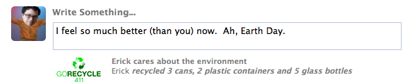 For instance, consider a Facebook app just that launched called GoRecycle411 (developed by Jerry Kelly, the former VP of finance at Mark Cuban’s 2929 Entertainment). You enter how many cans, bottles, newspapers, or office paper you’ve recycled and it tells you how much energy you saved and posts your achievement to all your friends via the Facebook News feed. It keeps a tally, and translates your energy into how many barrels of oil, trees, gallons of water, pounds of carbon dioxide, kilowatts of electricity, and cubic yards of garbage you save. It also keeps track of how much everyone using the application is saving.