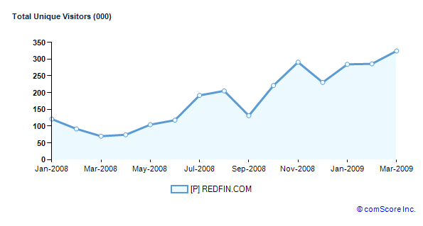 The downside to being a brokerage is that Redfin’s site only shows listings for the regions in which it operates. Nevertheless, traffic grew 300 percent last year to 1.6 million unique visitors, according to Kelman. ComScore estimates only 324,000 U.S. visitors in March, 2009, but shows a similar growth rate. (Again, remember that Redfin listings are not national, so compare these numbers to a collection of local brokerage sites).