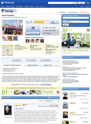 While MySpace is relying on Citysearch’s massive database of business listings (which includes hours, addresses, photos, menus, and videos), it’s starting from scratch on the review side of things. That might have handicapped a smaller site, but given MySpace’s audience, it shouldn’t take too long for the site to get populated: since it went live seven days ago, MySpace users have already written over 60,000 reviews.