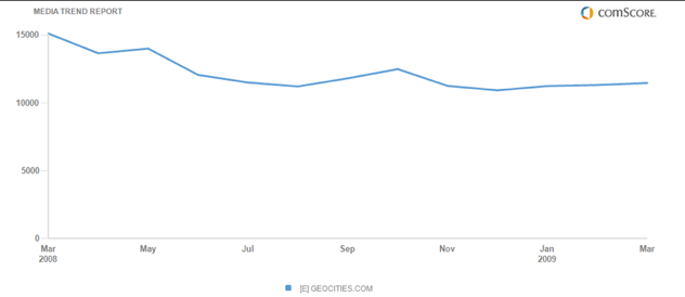GeoCities’ traffic has been falling over the past year. According to ComScore, GeoCities unique visitors in the U.S. fell 24 percent in March to 11.5 million unique visitors from 15.1 million in March of 2008. Back in October, 2006, it had 18.9 million uniques.