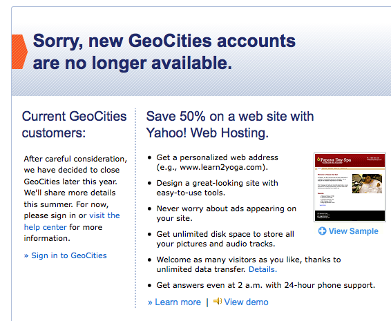 Not with a bang, but with a whimper. Yahoo! is unceremoniously closing GeoCities, one of the original web-hosting services acquired by Yahoo! in 1999 for $2.87 billion. (Fun venture fact: Fred Wilson’s Flatiron Partners was an investor). In a message on Yahoo!’s help site, the company said that it would be shuttering Geocities, a free web-hosting service, later this year and will not be accepting any new customers. Existing customers will still be able to access use GeoCities but Yahoo! is encouraging these customers to upgrade to Yahoo!’s paid Web Hosting service.