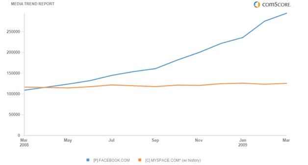 Facebook had an estimated 294.7 million unique visitors in March, 2009 on a worldwide basis, compared to 125.7 million for MySpace. While Facebook gained 19 million visitors during the month, MySpace gained only 2 million. In terms of pageviews, MySpace has seen a drop of 20 percent since January (to 37.9 billion), whereas Facebook has seen growth of 22 percent in the exact opposite direction (to 87.3 billion). And while MySpace is still bigger in the U.S., Facebook is closing that gap fast.
