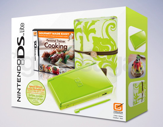 There’s no word on price, but Nintendo is releasing a new lime green DS Lite bundle in the US with Personal Trainer: Cooking on May 3 with a chichi case to match. Yay! I wonder who this bundle is targeted at? Can we please get Virtual Console for the DSi instead of this crap?