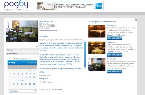 Pogby is one of the finalists competing in a startup competition at NYC Entrepreneur Week, where I was a judge today. The site is really not much more than an online demo right now, with only a half dozen venues in New York City on the site. But Gooch and his VP of sales Duane Lawrence plan to sign up 50 to 100 restaurants, bars, and other event spaces in short order. They are focusing on New York City to prove the concept. (This is really early stage—the company is still looking for seed funding). Each venue on Pogby gets its own page with pictures for each available event space, along with a calendar showing availability and a booking engine. Gooch knows a lot about reservation systems from his time at JetBlue, and you can see some of the design influences on Pogby.